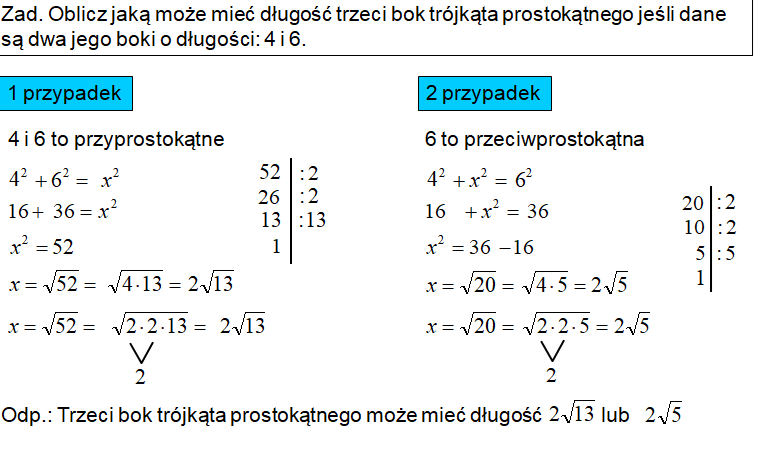 Trzeba rozpatrzyć dwa przypadki. Pierwszy to podane boki są przyprostokątnymi. Drugi przypadek to bok o długości 6 jest przeciwprostokątną.